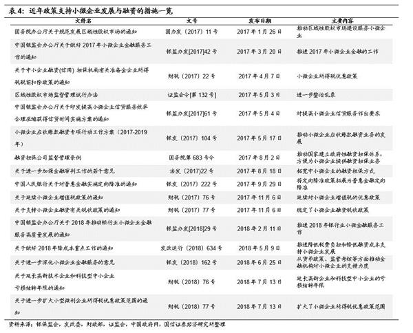 目前,我国政策当局出台了大量的政策(见表4),推动银行向民营、小微企业投放信贷,也已有一定效果,但与市场的期待仍有一定差距。事实上,小微信贷是一个相对专业、独立的业务门类,并非银行不能做,而是国内大部分大中型银行不具备相应的业务团队、技术和内部机制,简单地敦促它们去投放效果不佳,贸然从事甚至还可以带来巨大的损失,或者扰乱小微信贷市场。