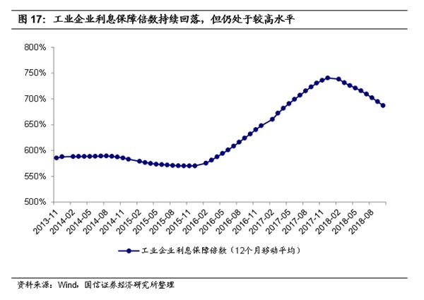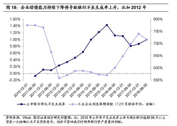 预计明年资产质量有所下行,不良生成率将上升。这种边际上的变化主要由工业和批发零售业贷款质量变化引起。今年以来工业企业偿债能力持续回落,给银行整体资产质量的继续改善也带来压力,从银行中报各项指标来看,行业资产质量转向平稳(具体分析见《银行业2018年中报综述(上):下半年政策环境有望好于上半年》)。目前工业企业利息保障倍数仍在回落,但仍然处于较高水平,所以我们估计后续工业及批发零售业贷款的质量难言好转,但大幅下降的概率也不大,我们认为更可能出现的情形是稳定或者平缓下行。当然,我们在明年也需要持续跟踪该指标的变化趋势,以及时发现其可能发生的不利变动。