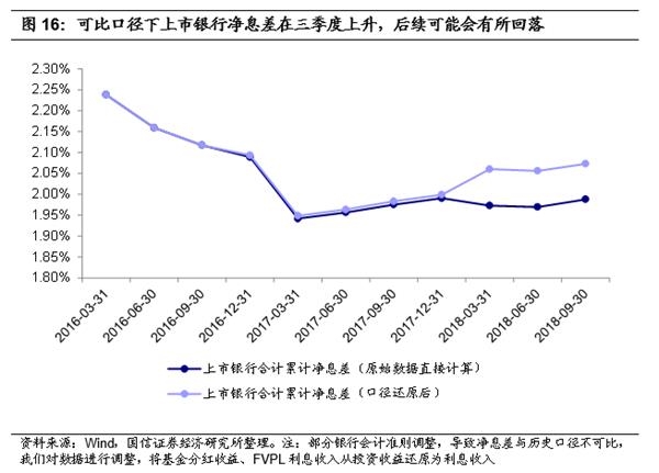 考虑到货币政策在边际上没有太大变化,尤其是基准利率没动,净息差不会有大幅的起落。从历史数据来看,净息差走势与基准利率相关性很强,市场利率只有大幅波动的时候才会对净息差产生一定影响,但影响幅度也不会很大。这主要是因为银行表内存贷款主要按照基准利率定价,非基准利率的变动对其影响很小。2017年一季度市场利率突然大幅上升,通过资产负债重定价的时点错配,引起银行净息差先降后升。从上市银行净息差变动趋势来看,这一先降后升的趋势在今年二季度接近尾声;但三季度同业利率快速下降,再一次通过资产负债重定价的时点错配,引起银行净息差在三季度上升,预计后续环比将逐步下降。因此,净息差同比增速到明年末可能会逐步回落至0%附近。