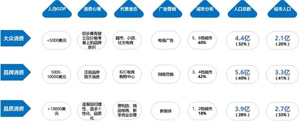 三四线城市处于品牌化消费阶段,正向品质化消费进化,覆盖5.6亿人口,占总人口的40%;对应城市人口数3.3亿人,占城市人口的41%。