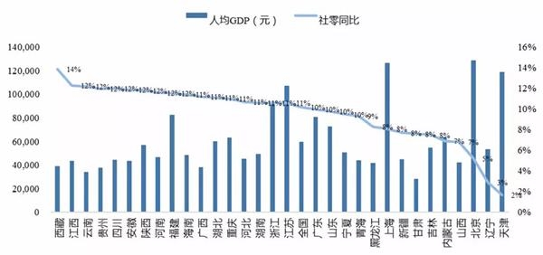 从消费来看,2017年社零总额增速前五的省为西藏、江西、云南、贵州和四川,而上海、北京、天津等省市的社零总额增速排名较为靠后。
