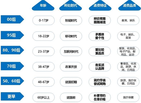 不同的年代背景影响了各年龄段的消费习惯和消费特征。