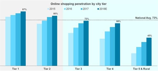 在这两方面因素的推动下,国内3-5线城市网购渗透率持续提升,增速明显高于一二线城市,低线城市的网购渗透还有很大的提升空间,市场下沉将成为电商市场未来重要方向。