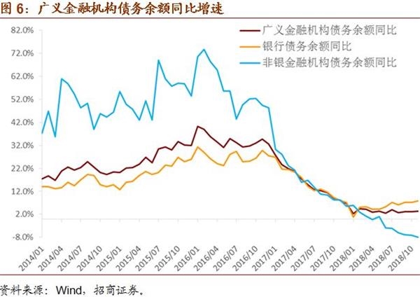 合并银行和非银金融机构来看,流动性压力最大的时候大体出现在2017年年中,2017下半年开始,流动性压力边际减轻。不过,在去杠杆的大背景下,央行货币政策始终保持警觉,所谓的流动性压力减轻,也仅仅是相对于2017年年中最紧时的情况而言。从基础货币供给的角度来看,其余额同比增速自2016年年底以来整体保持下行;11月末基础货币余额同比下降5.4%,前值同比下降6.8%,降幅略有收敛。