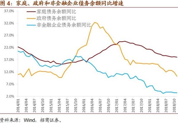 具体来看,11月末,家庭债务余额46.8万亿,同比增长18.1%,低于前值18.3%;家庭负债同比增速在10月出现轻微反弹后,重回下行,就目前的情况来看,我们认为家庭部门去杠杆的趋势仍会在较长时间内延续,对应房地产数据表现难言乐观。11月末,政府债务余额52.4万亿,同比增长10.3%,低于前值11.9%;现有高频数据显示,12月政府债务余额同比增速或出现轻微反弹,但目前的数据并未显示政策转向了放松和刺激杠杆增加,对应基建难有发力以及政策不会大幅放松;目前我们预计政府部门去杠杆或会持续到2019年3月份前后。11月末,非金融企业债务余额113.2万亿,同比增长3.5%,与前值基本持平;从现有数据分析,到2019年中附近,非金融企业会持续杠杆去化,但空间不大。