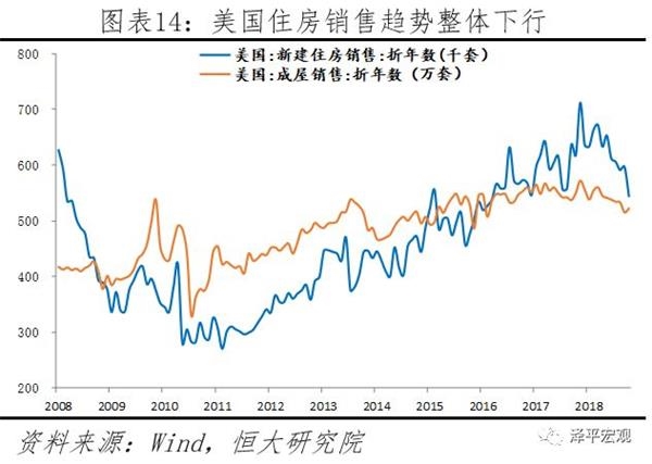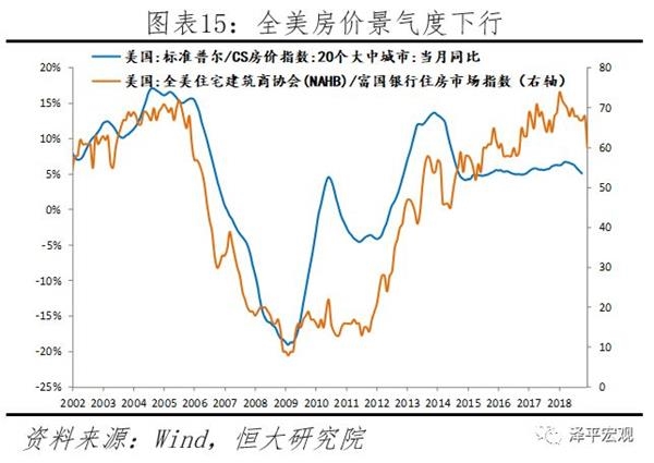 伴随美联储加息提升利率水平,当前美国房地产景气度已初现拐点,房屋销售、价格、投资均显示房地产景气下行。从销售指标看,10月新屋去库存时间大幅跳升至8.1个月,较9月提升0.9个月,连续7个月上升,已回到2011年水平。美国新屋和成屋销售均持续放缓,其中10月新屋销售折年数544千套,较9月减少53千套;从房价指标看,9月标准普尔20个大中城市房价同比5.15%,较8月下降0.38个百分点,已连续7个月下行;从综合指标看,美国房地产市场全国住宅建筑商协会(NAHB)/富国银行房地产市场指数11月快速下降至60,较10月下调8个点,创2014年2月以来单月最大跌幅。