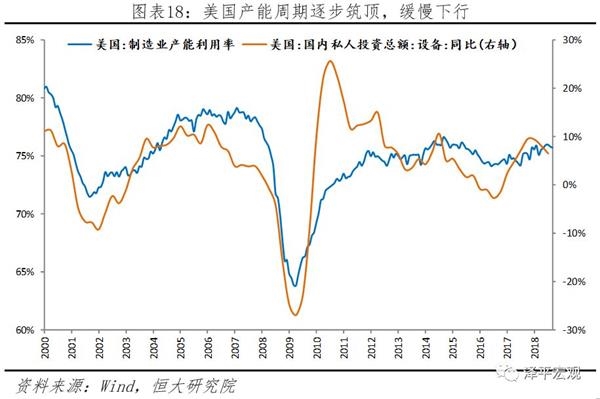 从时间维度来看,产能设备周期处于缓慢向下阶段,对美国经济增长边际贡献趋缓。由于本轮产能周期上升期的上升幅度不高,回落幅度预计也不大。从历史经验看,产能设备投资周期上半场一般在2-3年达到顶部,随即在顶部震荡或向下。比如,产能设备投资周期曾在2002Q1-2005Q1回升,2005Q2-2006Q1筑顶,2006Q2-2009Q2回落;在2009Q3-2010Q3回升,2010Q3-2016Q3回落。本轮产能周期自2016年4季度开启,2017年第4季度回升到高点,其后连续3个季度缓慢向下,上升期约1.5年。2018年三季度设备投资同比6.6%,较二季度下滑1.2个百分点,连续3个季度下滑。从经济运行规律来看,伴随特朗普减税红利效应边际减弱以及基建落地前景不明,企业的投资预期边际减弱,设备投资增速或将持续放缓。