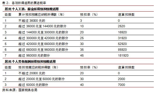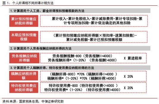 工资薪金采取累计预扣预缴,尽可能贴近真实纳税情况,减轻对纳税人的资金占用,大大降低个人办理汇算清缴的几率。在8月31日的报告《个税改革新征程:“综合”+“扣除”的意义远远大于5000元起征点》中我们强调,由于我国税务信息系统的不断完善,目前我国已经具备了个人所得税由分类计征向综合计征逐步转变的条件。综合计征的特点除了增加专项扣除以外,还将纳税各个来源的收入打包,作为统一的税基征税。这样做的好处就是能够更加真实的还原纳税人的收入情况,实现更公平的税收调节作用。但是考虑到计征的方便性,目前的计征方法还是采取源泉课征、预扣预缴的方法,但是在年底会有汇算清缴。工资薪金是大部分纳税人的主要纳税税基,此部分采取累计预扣预缴,目的是为了尽可能地贴近真实的纳税情况,以减轻对纳税人的资金占用,降低纳税人办理汇算清缴的几率。而对于劳务报酬、稿酬和特许权使用费,采取的是按次或者按月预扣预缴的方法。具体的计算情况如下: