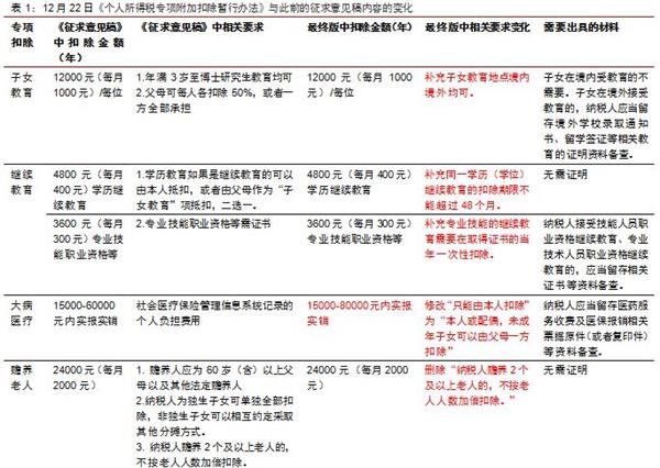 ▌ 专项扣除中提高了大病医疗与房租的扣除额度。我们把最终颁布的《个人所得税专项附加扣除暂行办法》与此前的征求意见稿进行对比发现,大病医疗支出和房租的扣除额得到了提升。大病医疗支出的扣除额由每年1.5万-6万提高到1.5万-8万,房租的扣除额由每月800元-1200元提升到800元-1500元。除此之外,也更加明确了对于每一项具体的专项扣除的实施期限。如房贷的扣除不能超过20年(240个月),同一学历(学位)继续教育的扣除期限不能超过4年(48个月)。因此综合来看,最终版的个税相比于征求意见稿略超预期。