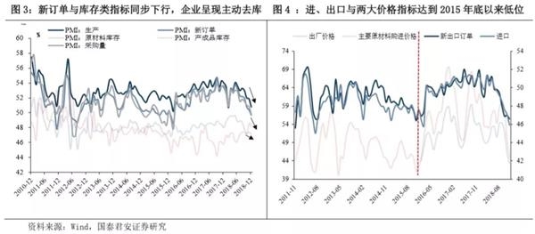 (2)两大价格指数明显走弱(图2)。PMI两大价格指数出厂价格指数和原材料购进价格指数较11月分别回落近3.1和5.5个点至43.3%和44.8%。需求疲弱以及月内大宗商品价格持续下行构成主要影响,明年下行速率将显著加快,下半年或转入负区间。