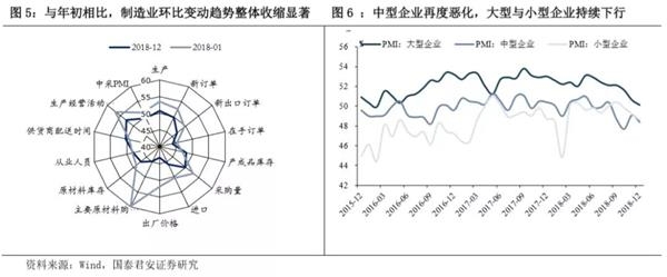 官方制造业连续创新低,经济下行压力进一步加大。12月我国官方制造业PMI达49.4%,为自2016年2月以来的低点,较上月回落0.6个点,强于季节性,17年、16年两年,12月PMI较11月比,分别下行0.2和0.3个点。2018年制造业PMI全年均值50.9%,显著低于2017年的51.6,整体反映当前经济边际恶化加剧,与此同时,企业主动去库迹象显现。