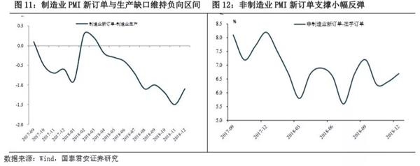 (1)总体供需缺口进一步收窄(图1)。生产端,本月PMI生产指标分项较上月继续大幅下降1.1个点至50.8%,大幅低于17年同期。需求端,本月PMI新订单指数较上月下降0.7个点,经济承压不断加大。供需缺口保持收窄趋势,新订单指数与生产指数之差较11月下降1.9个点至1.8%。