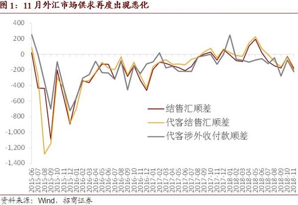 1、 11月结汇率明显下滑5个百分点至60%是最值得关注的一个不利信号。11月我国外汇市场供求形势再度恶化,对此我们并不感到意外,我们在此前的点评报告中便指出,10月份数据上的“改善”很可能仅仅受到了工作日减少以及“抢出口”的扰动。代表零售外汇市场的银行结售汇逆差相较10月份明显扩大1038亿元,11月实现逆差1241亿元。其中银行自身结售汇顺差153亿元,顺差环比扩大115亿元;银行代客结售汇逆差再陷明显恶化,实现逆差1394亿元,相较上月扩大1153亿元,其中结汇意愿的明显恶化成为重要的拖累。分项目来看,经常项目逆差897亿元,逆差扩大533亿元;资本与金融项目差额再度由顺转逆为逆差497亿元,相较10月份明显恶化620亿元。11月远期净结汇签约319亿元,10月数据为净结汇191亿元,但从前期签订的远期合约的履约情况来看,仍是净售汇状态,对11月结售汇数据形成了边际恶化。