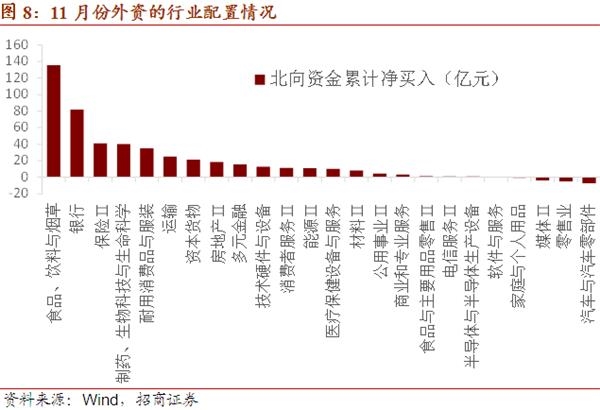从11月份外资的行业配置情况来看,食品饮料、银行成为11月最受外资青睐的行业,外资对汽车、零售、传媒则进行了减持。