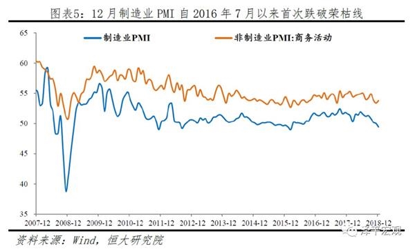 12月中国制造业为49.4%,为2016年7月以来首次跌破荣枯线,创2016年3月以来新低。新订单指数为49.7%,较上月下跌0.7个百分点,为2016年2月以来的低点。其中进口指数45.9%,较上月下跌1.2个百分点,连续6个月在50%以下,反映内需活动低迷。新出口订单指数46.6%,较上月下滑0.4个百分点,已是连续7个月低于临界点,创三年新低,反映外需疲弱。PMI主要原材料购进价格指数和出厂价格指数均降至年内低点,分别为44.8%和43.3%,较上月回落5.5和3.1个百分点,通缩风险上升,企业利润下滑、实际上升。