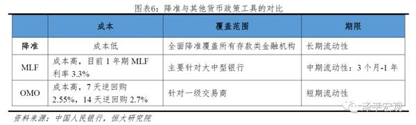 从投放成本、投放范围和资金期限来看,降准均优于OMO和MLF,能够为银行提供长期、无成本、稳定的资金,从而更好的服务实体经济。从资金成本来看,通过OMO释放资金的成本在2.55%-2.7%,1年期MLF成本3.3%,降准的成本最低;从资金投放范围来看,全面降准能够覆盖所有存款类金融机构,而OMO和MLF大多只针对一级交易商,降准更符合普惠金融的理念,且由银行主动控制,节奏灵活,能够为实体经济提供稳定的资金;从资金期限来看,降准能够释放长期流动性,既能够打开长端下行空间,也能够保持短期流动性合理充裕,带动短端利率下行。而OMO和MLF仅能够提供短期和中期流动性,影响远小于降准;从银行来看,降准释放资金更加稳定,投放OMO和MLF的时间和金额都由央行决定,银行是被动接受,而降准释放的资金银行可以直接控制。