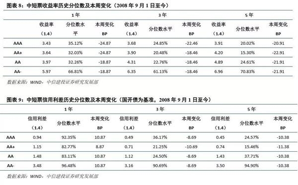 这两周(12.24-1.6)中短票收益率全面下行,中高等级1Y最多,低等级5Y最多;中短票收益率历史分位数的差异仍然主要是评级差异,AA-在60%-70%,中高等级不超过40%,但中高等级中1Y稍高;信用利差变化不一,1Y走阔,3Y、5Y收窄;信用利差历史分位数AA-基本在90%以上,除1Y外中高等级分位数较低。