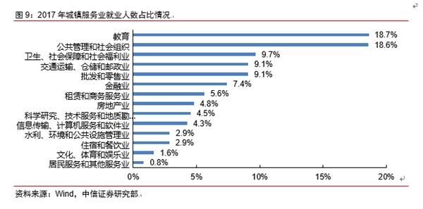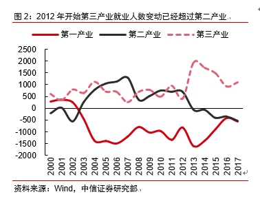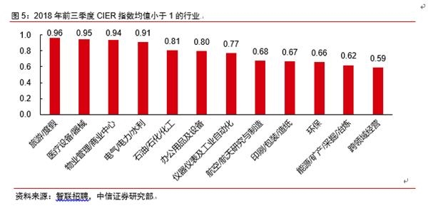 2。 总量角度,劳动生产率的不断提升使得我国就业弹性持续下降;产业层面,由于第二产业劳动生产率上升的速度往往快于第三产业,因此第二产业吸引就业的能力开始下降,劳动力从第二产业转移到第三产业的趋势进一步加强,第三产业对经济增长的贡献开始超过第二产业,就业的变动体现出经济产业结构转型的效果较为明显。具体到2018年,CIER细分行业指数中,低于1的行业个数较2017年减少1个。前三季度制造业CIER指数出现下降的细分行业比重大于服务业下降的行业比重,因此在整体就业下行压力出现的时候,服务业的扩张态势仍然好于制造业,说明经济内在的产业结构转型仍在持续,取得一定成果。
