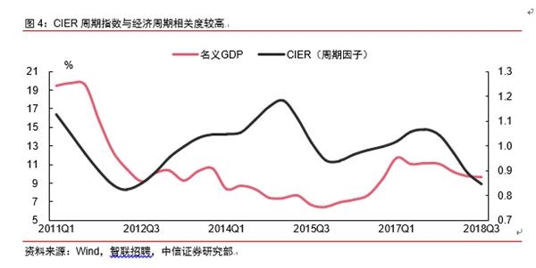 经济增长带动的增量上升,吸引就业的能力随着上涨。我国当前经济总量超80万亿,增长1个百分点相当于5年前的1.5个百分点,10年前的3.1个百分点,经济增长带来的增量更多,需要的就业岗位也随之上升。然而我国适龄劳动力增长拐点已至,未来就业供需缺口逐年拉大,因此CIER指数中包含着一直增长的趋势性特征。一般而言,经过1、2季度社招人群跳槽高峰以及大学生毕业季之后,3季度的求职申请人数一般会出现回落,即3季度的CIER指数会季节性偏高。剔除季节因素和趋势因素的CIER周期因素指数从2017年4季度开始显著下行,截至2018年3季度,指数已经回落至0.85。从下图可以看出,CIER周期指数与名义GDP走势吻合度较高,一定程度上说明CIER所显示出的周期性就业压力较为真实,经济下行压力确实有所加大。