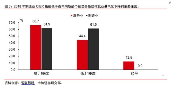 如果将49个细分行业归纳为制造业和服务业,2018年前三季度,制造业中,CIER指数高于去年同期的细分行业个数比重为61.9%,低于去年同期的为61.5%;而服务业细分行业中,CIER高于去年同期的行业个数比重为66.7%,低于去年同期的为44.4%,持平的为12.5%。因此,如前文所言,2018年以来国内就业市场的压力来源主要集中于制造业,特别是传统制造业和周期行业。但高端制造业和服务业吸纳就业的能力不断提升,一定程度上反映出我国当前产业结构转型的正面效果和经济增长模式逐渐转向的积极成果。