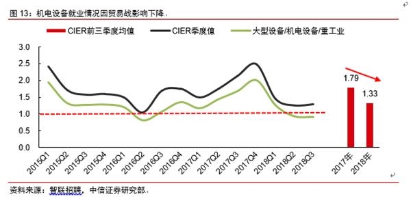 2018年前十个月我国对外出口增速在“贸易抢跑”和转口贸易的带动下,并未明显回落。但由于中美贸易未来走势仍存较大不确定性,对外贸导向型企业的预期产生负面影响,这些企业继而提前缩减规模。从就业数据可以看出,一些行业确实已经开始出现岗位供给减少的现象。目前在美国对中国加征关税的2500亿美元商品中,机电类产品规模比重最大,达1200亿美元左右。2018年前三季度,大型设备/机电设备/重工业的CIER指数逐季下降,2、3季度已经跌破供需平衡点。从事贸易中间商的企业也面临较大压力。2018年前三季度CIER贸易/进出口指数均值较去年同期下降0.46个百分点,且二、三季度明显低于去年同期水平。虽然我国耐用消费品(服饰、纺织、皮革、家具、家电)的出口规模较大,但此次美国公布的2500亿美元加税清单中,所涵盖规模较小。因此从CIER指数中并未反映出,反而2018年前三季度耐用消费品的就业景气指数较去年同期上升了0.27。对于其他2500亿美元清单中涉及到的子行业来说,贱金属、车辆拉动的就业分别为5.2万和4.3万人,仅次于机电(44.4万)、杂项制品(11.9万)和纺织(10.9万)。但从贱金属和汽车的CIER指数来看,中美贸易战暂时尚未对行业景气产生显著影响。