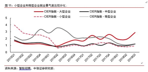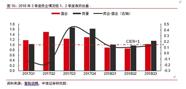 3。 随着一系列针对民营小微企业发展的扶持政策出台,从就业情况的变化可以反映出,民营企业的经营状况出现改善。2018年第三季度,民营企业的CIER指数已经明显高于前两季度。从企业规模的角度来看,2018年前三季度,“小型”企业的就业景气度小于1,但“微型”企业的景气度仅次于最高的大型企业,小、微企业之间的扩张态势出现分化。