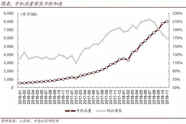后4G时代,随着流量单价的快速降低,用户数据用量呈现爆发式增长,2018年11月户均流量已经达到5.8GB(是年初2倍)。5G网络的快速发展,有望进一步推动流量单价下滑、用户流量快速增长;与此同时,随着物联网的规模放量,连接数和数据流量均呈现快速上涨态势。我们认为快速增长的数据量将增加市场对IDC的需求,为带来行业持续增长动力。