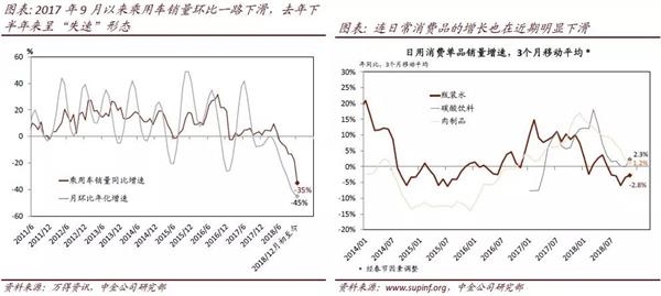 通缩预期上升本身也会抑制当期消费需求——近期零售增速可能降至“7字头”,为2003年(非典时期)以来最低。收入增长放缓和负向财富效应对消费的不利影响之外 [7],通缩预期上升会降低未来消费的“机会成本”,从而抑制当期消费需求——尤其是涉及价格波动较大、周期属性相对明显的消费品(如汽车)。虽然有“双十一”线上促销的季节性提振,2018年11月零售增速不升反降(至同比8.2%)。考虑到每年“双十一”对前后消费的“挤出”效应、以及汽车销售继续减速(12月前3周汽车销量同比增速下探至-35%),不排除近期零售增速会跌破8%。
