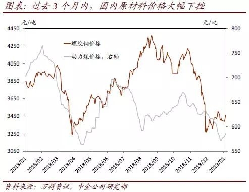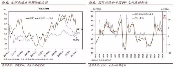 如果逆周期调节政策仍然力度不足,PPI在未来几个月大概率快速下跌,同比增速可能在今年2季度再次转负。去年11月PPI的环比增速已经转负。假设当前需求疲弱、供给侧政策边际宽松的趋势不变,PPI同比增速也可能几个月内降至负值,尤其是考虑到去年国内外大宗商品价格的基数都偏高。其实,很多有代表性的工业品价格绝对水平已经明显低于2018年年中——国内螺纹钢(HRB400,20毫米)和动力煤(5500卡)在去年6月的均价分别约为每吨4,175元和682元,而彼时布伦特原油均价在76美元/桶的高位——目前,螺纹钢价格已调整为3,928元/吨、动力煤为586元/吨,而布伦特原油已经跌至58美元/桶。此外,值得注意的是,早在环保/供给侧政策调整之前,很多下游产品的价格(如汽车,存储器)已经开始走弱,反映出需求增长下行。往前看,虽然基建投资可能温和复苏,但今年地产投资面临同比大幅减速、甚至下跌的风险[3]——总体看,原材料需求仍面临较大的压力。另一方面,总需求减速、收入增长减缓也会继续削弱下游制造业的定价能力。