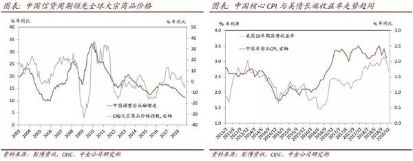 中国内需减速、通胀下行会抑制全球的增长和通胀,尤其是对中国相关需求依赖度较高的行业和国家,如原材料产地及一些可选消费商品和服务的输出国。全球制造业景气周期与通胀走势日渐“趋同”。同时,随着中国占世界经济和贸易的比重上升,中国内需增长对全球可贸易品价格的推动效应也愈发明显。2017年中国贡献了全球约30%的实际增长,而中国工业产出增长占全球工业扩张的近三分之一。然而,中国在全球工业原材料消费中的份额更大。正如我们在之前报告中所分析的,2016-17年中国经济再通胀对全球制造业景气度的提升和工业品价格的上升都起到了关键的推动作用[9]。随着中国金融条件收紧、内需增长放缓,我们预计中国进口增速的下降速度将快于出口,贸易顺差将随之扩大,而全球制造业周期也可能随后走弱[10]。同时,随着中国经济快速增长、并持续融入全球经济,中国跨境资本流动也成为全球资产价格变化的重要驱动因素——近年来,我们注意到中国通胀压力与全球无风险利率之间呈现明显的相关性,如中国核心CPI和美债长端收益率。中国对全球通胀和资产价格的影响力攀升主要是由于中国在全球需求中的重要性持续上升,同时中国跨境资本流动的影响也日益增强。