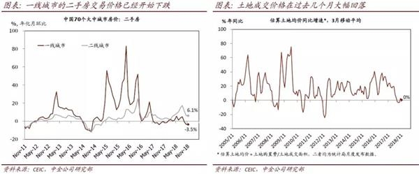 我们预计2019年地价“双降”,尤其是三线城市房价下行压力最为显著、高点至低点跌幅或将达到15%。国内商品房和土地市场呈现出愈发明显的走弱迹象——一线城市的二手房交易价格已经开始下降,而土地成交价格在过去几个月大幅回落。在最近的研报中,我们对地产周期做出了判断——在当前的宏观经济形势下,如果不在中央层面对抑制住房需求和开发商融资的政策进行及时有效的调整,商品房的供需平衡可能会在接下来的几个月加速恶化,最终导致商品房交易量价齐跌、而投资增速大幅下行[5]。