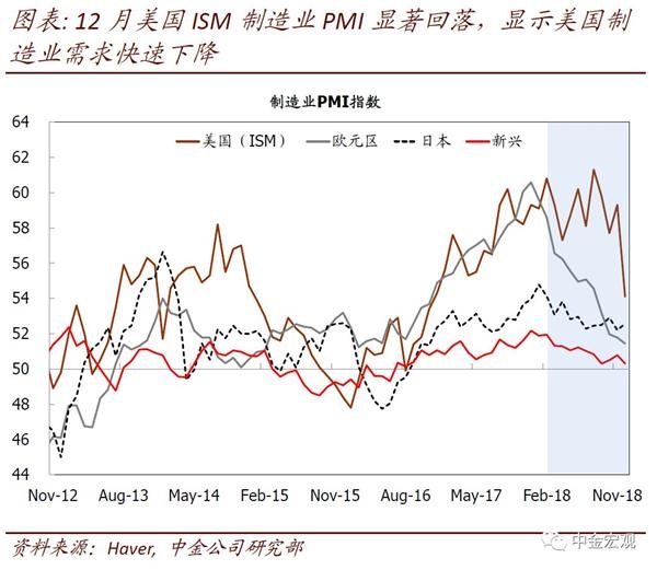 1)对抬升、金融条件收紧敏感行业下滑加速。其中以地产、设备投资、耐用品消费表现最为明显。最新数据显示,11月成屋销售同比负增长7%,10月新屋销售同比下滑11%,且均是加速下滑;11月核心耐用品订单3m/3m年化环比增速已从去年中12%一路下滑至11月的-0.6%;2)放缓正在向更加广泛的部门蔓延,如制造业。12月ISM制造业显著下滑,其中新订单跳水,显示美国制造业面临的需求正在迅速走弱。另外,工业产出中制造业产出的数据与此形成印证,其产出环比增速已连续4个月放缓,10月和11月分别环比-0.1%和0.0%;3)需求放缓也对通胀形成压制。需求的放缓,也在缓和美国经济内部的供需紧张,对通胀形成压制,11月核心PCE通胀回落至1.9%。以地产为例,需求走弱不仅传导至成交量及地产投资,也导致地产价格增速放缓,对通胀造成拖累。