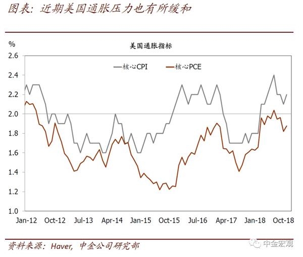 预计美联储将进一步向鸽派立场调整。基于对增长及通胀预测的更新,我们认为,美联储2019年继续加息的必要性显著下降,其将进一步向鸽派立场调整。基准情形下,我们预计美联储2019年加息1次(vs。此前预测的2次)。而且,我们认为这一预测面临一定下行风险,且这种下行风险正在上升:如果美国经济因为金融条件收紧冲击或者外部冲击(如中国增长快速放缓拖累)放缓过快,通胀停止上行,美联储可能就此停止加息周期。