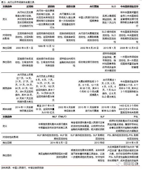 中央人民银行公开市场操作工具包括正回购、逆回购、现券交易、央行票据、短期流动性调节工具(SLO)、中央国库现金定存。2012年前,人民银行公开市场操作以正回购和发行央行票据为主,这两种工具的操作都具有回收流动性、减少流动性供给的作用;2012年后(特别是2015年后),人民银行公开市场操作以逆回购为主,同时创新了短期流动性调节工具SLO、常备借贷便利SLF、中期借贷便利MLF、抵押补充贷款PSL等创新型货币政策工具,作为逆回购等公开市场操作的补充,这些工具的创设和开展都能增加流动性供给。
