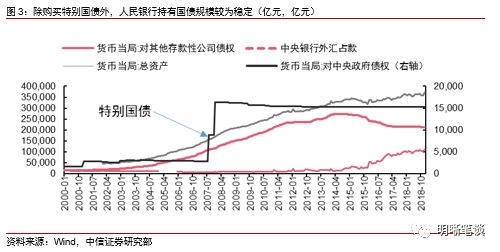 除购买特别国债外,人民银行持有的国债规模较为稳定。人民银行曾经通过商业银行(农行等)购买过财政部发行的特别国债,分别用于补充四大国有银行资本金和汇金资本金;2017年特别国债到期续发后人民银行继续通过商业银行持有较大规模特别国债。但除以上特别国债交易外(仍然属于二级市场交易),央行今年都为直接购买国债,所持国债规模较为稳定。
