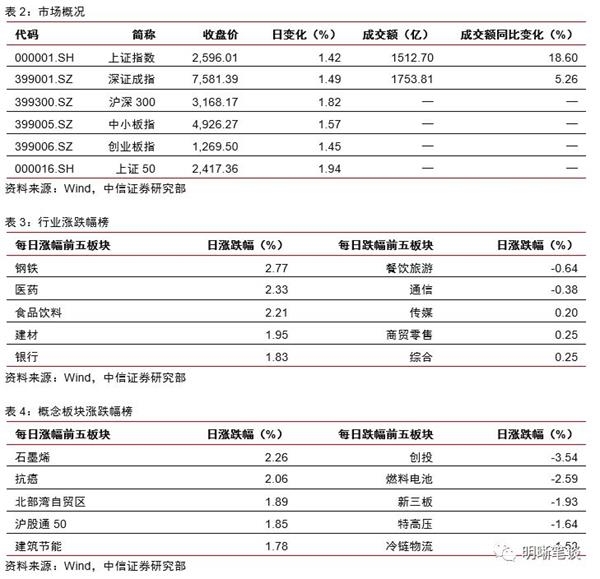 2019年1月18日,银行间回购加权利率大体下行,隔夜、7天、14天、21天和1个月分别变动了-8.69bps、1.17bps、-6.7bps、-7.82bps和-2.67bps至2.16%、2.55%、2.34%、2.82%和2.81%。国债到期收益率大体上行,1年、3年、5年、10年分别变动-0.02bp、1.88bp、4.27bps和1.50bps至2.35%、2.71%、2.94%和3.09%。上证综指收涨1.42%至2596.01,收跌1.49%至7581.39,收跌1.45%至1269.50。