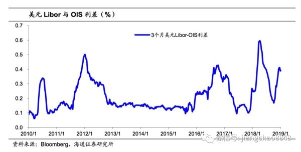 美元Libor和OIS利差重新走阔。我们18年4月的报告《不一样的美元荒》中曾分析过18年4月Libor-OIS利差上行的现象。而目前三个月美元Libor和OIS利差在18年10月中下旬重新开始走阔,从18年10月中下旬的19BP升至18年末的40BP,高于历年同期水平(2015年至2017年年末利差分别为23BP、33 BP和26 BP)。步入2019年,美元Libor与OIS利差企稳微降,截至1月22日仍在36BP左右的高位。