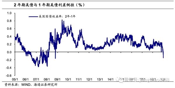 4)美债短端收益率曲线倒挂。18年末,美债2年-1年利差出现08年金融危机以来的首次倒挂,与此同时,美债3年-1年利差和5年-1年利差同样在18年末出现倒挂,并持续到19年1月中旬。