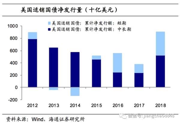 国内则面临财政支出压力,短期国债发行增加。特朗普减税政策虽然可以促使美国企业海外利润回流,短期刺激经济增长,但其负面影响是导致政府收入减少,财政赤字攀升。根据我们的统计,18年前11个月美财政赤字8594亿美元,同比增长30.7%,而17年同期赤字的增长率仅为18.7%。其中18年前11个月美仅同比增幅为0,17年同期则为3.3%左右。