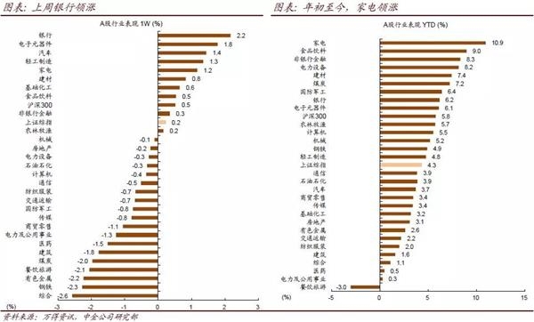 上证综指全周微涨0.2%。临近长假,两市成交较为清淡。风格上,大盘蓝筹好于中小市值股票。行业方面涨跌互现,行业政策提振下银行板块领涨市场;电子、汽车、轻工等此前低迷板块小幅反弹;家电、食品饮料等消费股相对稳健;获利了结下创投概念想关标的有所调整;钢铁、有色、煤炭、建筑等强周期板块小幅承压。