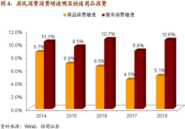 在居民消费支出中,2018年服务消费占比达到60.9%,增速为10.6%,同期商品消费占比为39.1%,增速为5.1%。居民用于服务消费的支出规模和支出增速都明显好于商品消费。