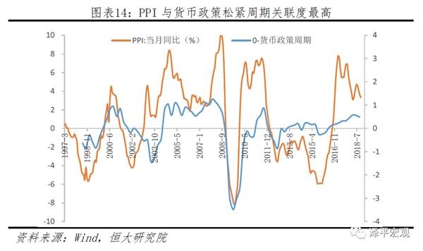 通过不同指标的对比,我们发现PPI与货币政策松紧程度变化趋势最为接近。货币政策松紧程度不仅与央行调整存款准备金率和利率,还与公开市场操作、信贷政策、监管政策相关(详见《货币还会放松吗?——货币政策周期视角》)。见下图,蓝色的线数值越大说明货币政策越紧。从2000年到现在,PPI的3次由正转负,也导致了货币政策3次大的放松;当PPI由负转正时,货币政策相应有所收紧;PPI为正数的时候,货币政策大多数也是处于收紧的状态。