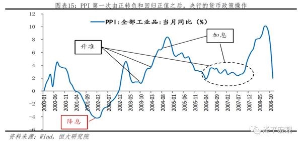 PPI第一次由正转负,央行通过公开市场操作和降息释放流动性,货币政策稳健偏松。2001年中国加入WTO,吸引大量外资,企业技术水平得以提升,成本下降引发物价水平的下滑。PPI由2000年7月的4.5%下降到2001年3月0.2%直至2002年2月的-4.2%。央行于2001年下半年在公开市场操作购买现券释放流动性,效果不明显。在PPI的低点2002年2月之际,央行启动降息,1年期存款利率下调25个BP、贷款利率下调50个BP.PPI开始回升,货币政策暂缓操作。