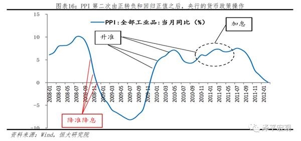 从PPI和货币政策的调整过程中,我们可以发现几条规律:1)央行降准降息只发生在PPI为负值或下降趋势之时。降准主要发生在PPI有下滑趋势或为负时;降息仅发生在PPI为负时,仅在2008年的降息PPI未是负值,但PPI属于下降趋势。2)央行升准加息只发生在PPI为正值之时,从过去历史来看,无一例外。3)PPI下降力度越大,央行货币政策放松节奏力度越快。