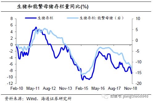 生猪存栏量反映了未来的猪肉供给,进而能够预测猪价。从猪周期来看,存栏量增速上行一般意味着未来半年后生猪出栏量出现回升,供给的上升会对猪价产生向下压力,所以存栏量同比的滞后项与猪价存在反向关系。在生猪存栏量屡创新低和同比增速持续下降的背景下,市场对19年猪肉价格上涨的预期不断升温。