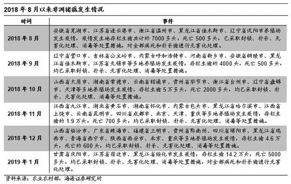 更重要的是非洲猪瘟的发生加速了产能去化。首先,疫情扑杀会导致存栏量被动去化。自18年8月2日沈阳市发现我国首例非洲猪瘟以来,我国多地都发生了非洲猪瘟疫情。由于非洲猪瘟传染性高,死亡率达100%,因此一旦发生疫情就需要全面扑杀,这就导致生猪存栏量被动去化。同时,猪瘟发生地区主要是在生猪养殖地区,生猪养殖户因为担心之后的疫情进一步扩散也会对生猪补栏持观望态度。