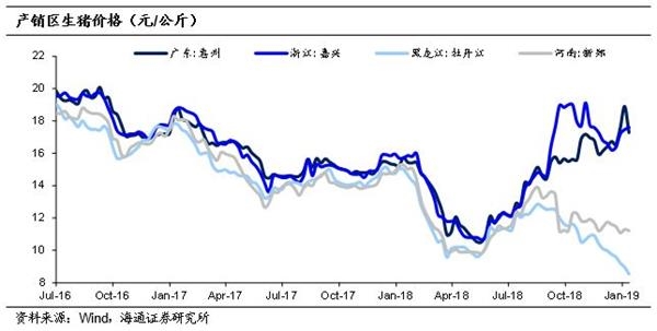 生猪调运限制导致供需失衡,产区猪价大跌打击养殖户积极性。非洲猪瘟具有高传染性和高致病性,而由于生猪调运会导致猪瘟扩散,因此2018年8月底农业部出台了限制生猪调运的政策措施,导致不同区域的生猪供需失衡。一方面,生猪主要产区因为生猪供给增加而导致价格大跌,其中黑龙江猪价已经下降至目前的8.5元/公斤;另一方面生猪主要销区因猪肉供给减少而导致价格上涨,其中广东猪价已经升至目前的17.3元/公斤。生猪产区的猪价下跌导致生猪养殖户补栏积极性下降,也进一步加速了生猪产能的去化。