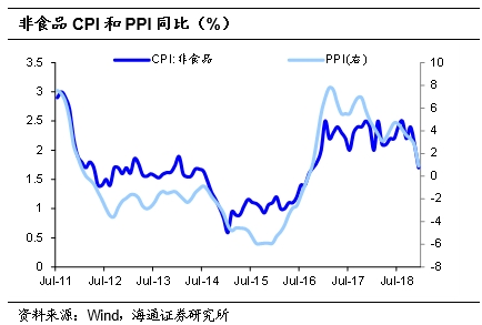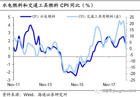 PPI跌回负值将对非食品CPI形成压制。由于PPI同比刻画的是工业产品出厂价格,属于非食品CPI的上游价格,因此非食品CPI价格和PPI走势高度相关。2018年10月以来PPI同比从3.3%大幅下降至0.9%,非食品CPI同比也从2.4%下降至1.7%,特别是受到国际油价下跌影响,交通和通信价格同比已经从10月的3.2%下降至12月的-0.7%。