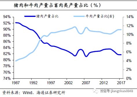 具体来说,18年各项货币增速均在下滑,其中M1增速和社融增速累计下降10.3和3.6个百分点,而M2全年一直处于8%左右的历史低位。货币指标往往领先需求,这意味着19年上半年总需求不会有太大起色。其次,消费习惯的转变导致猪肉在居民肉类消费中的比重逐年下降,17年猪肉在畜肉类产量中的占比下降至81.7%,低于前几年83.5%的水平。因此,根据目前的存栏量情况来判断,我们预计今年猪肉CPI同比或在年中达到10%-15%左右,如果存栏量同比增速进一步下降,那么不排除下半年猪肉价格进一步上涨的可能。