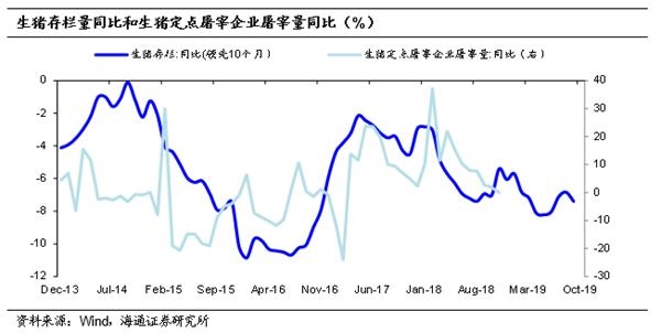 前期存栏量加速回落确实会导致今年猪价回升。目前猪肉产能一直处于加速去化阶段,前期存栏量下降对猪肉供应的影响已经反映在生猪屠宰量上,定点企业生猪屠宰量同比增速已经从18年2月的37%持续下降至10月的1.8%。相对应的,猪肉价格在2018年5月触底以后也出现了小幅反弹。根据存栏量同比对猪肉供给的领先关系,我们预计今年上半年猪肉供给会出现一定程度的减少,支撑猪价上涨。